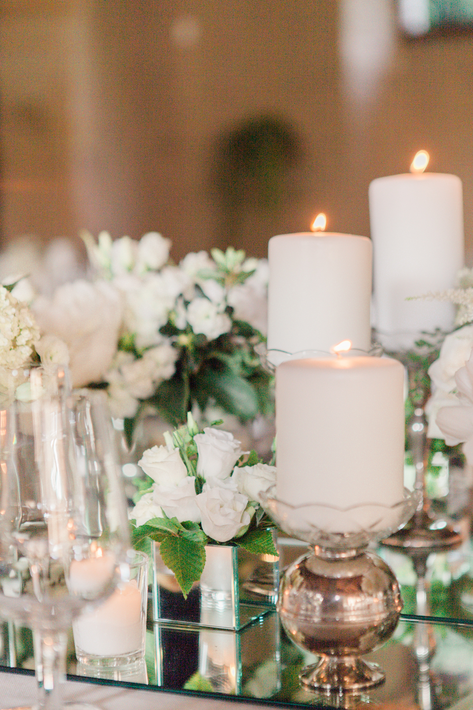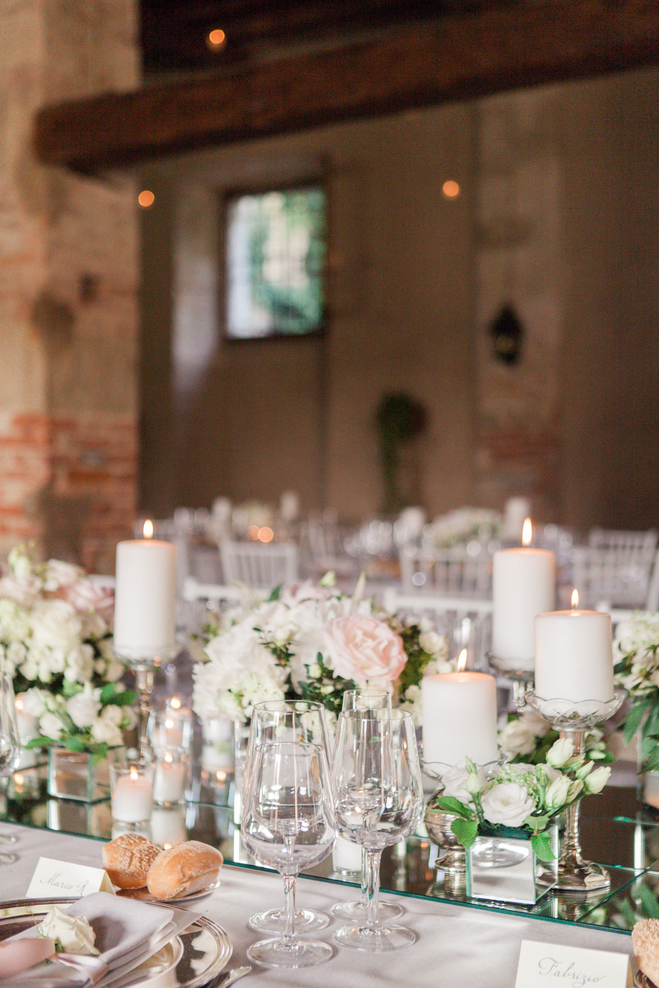 Visto l’abito, Maurizio Buzzi, il flower designer scelto dagli sposi, si è lasciato ispirare per la creazione del delicato bouquet di peonie bianche e rosa. A proposito del tavolo imperiale allestito per la cena, Margherita Orlandi, la wedding planner che ha curato e progettato ogni dettaglio di questo matrimonio da favola, mi ha raccontato: la sposa mi ha chiesto di dare libero sfogo alla mia creatività per conferire all’ambiente un tocco chic e raffinato. Così ho immaginato un’atmosfera fresca e luminosa, dominata dai colori pastello e scaldata dal brillio delle candele. Il mio scopo era quello di creare un allestimento elegante in contrasto con l’aspetto country della tinaia dove gli ospiti avrebbero trovato posto. Con l’aiuto di Maurizio ho immaginato un grande tavolo imperiale al centro dello spazio ed un insieme di tavoli rotondi tutt’intorno. Un tripudio di fiori a centrotavola: rose inglesi (il fiore preferito della sposa), peonie e fresie unite a specchi ed antichi candelabri d’argento. Per legare i tovaglioli ho scelto un nastro di seta rosa cipria con un fiore annodato con un fiocco. Mi sono poi rivolta ad un calligrafo per scrivere i nomi degli invitati sui segnaposto. Infine, insieme a Martina, abbiamo deciso di aggiungere all’atmosfera un piccolo tocco di magia, ricreando sul soffitto l’effetto di un cielo stellato. Centinaia di candeline appese con un filo invisibile hanno così fatto brillare gli occhi di sposi ed invitati, la foto del brindisi intorno al tavolo imperiale è in assoluto la mia preferita!